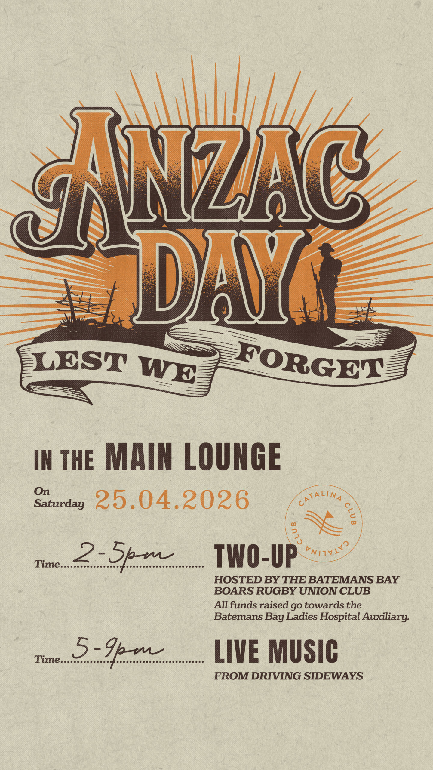From 2pm to 5pm, the Batemans Bay Boars host the region’s iconic game of Two-Up, a tradition that brings people together in shared history and connection.