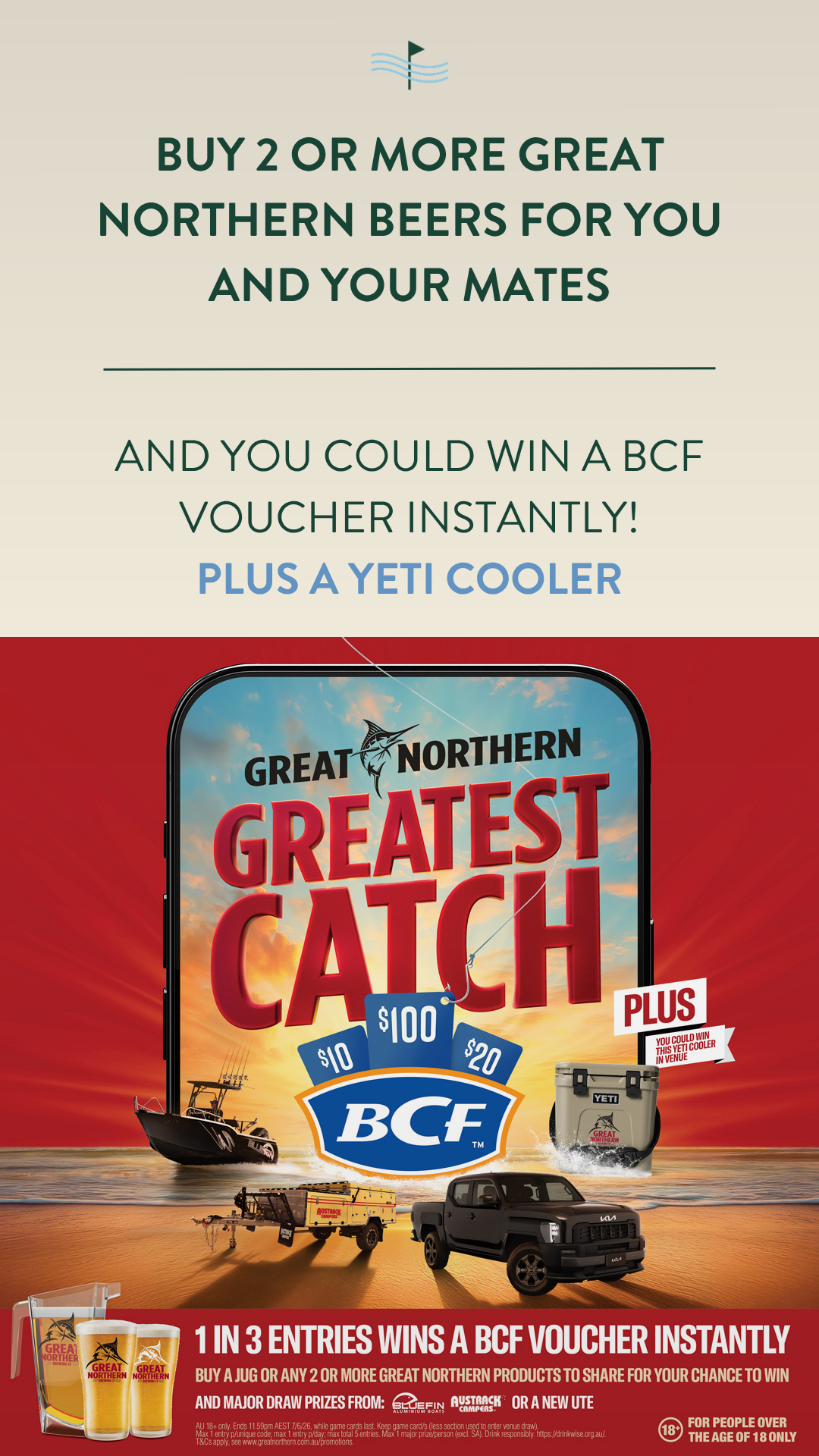 Score the Greatest Catch at Catalina Club this autumn with Great Northern Brewing Co. With any purchase of two or more Great Northern products at any bar across Catalina Club, you can enter BCF’s huge prize pool including prizes from Austrack Campers, Bluefin Aluminium Boats and Yeti.