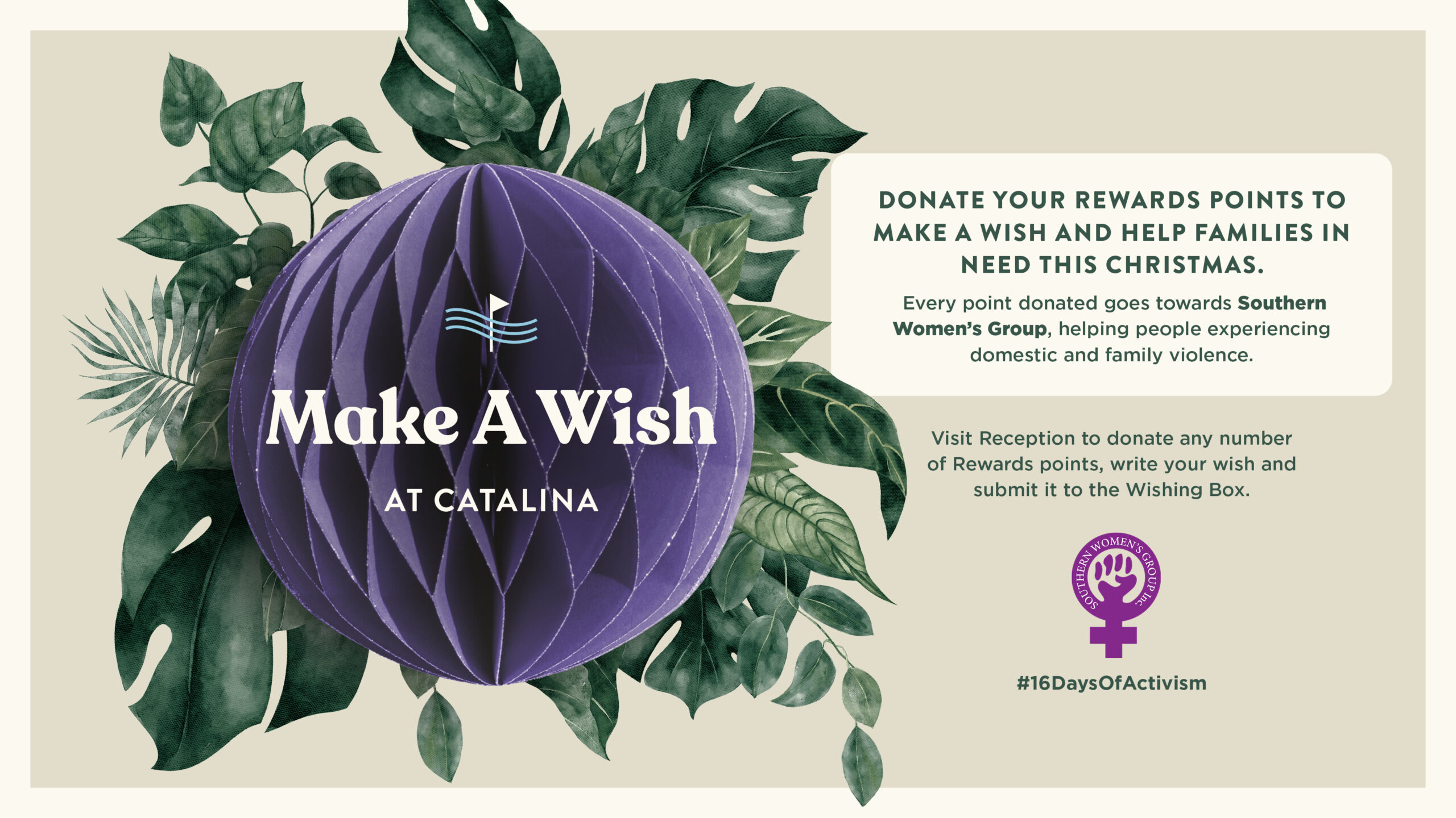 By making a wish, you can donate a portion of your Catalina Rewards points to Southern Women’s Group. The team at Southern Women’s Group will convert all received funds into gift cards for struggling families to buy household essentials and vital items ahead of Christmas.